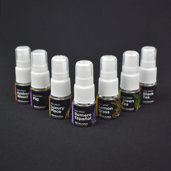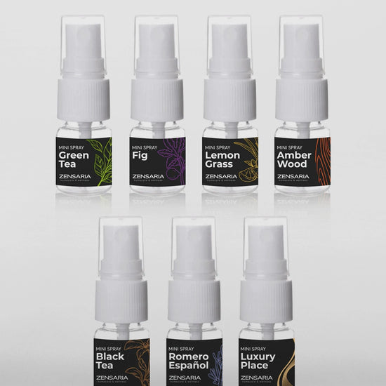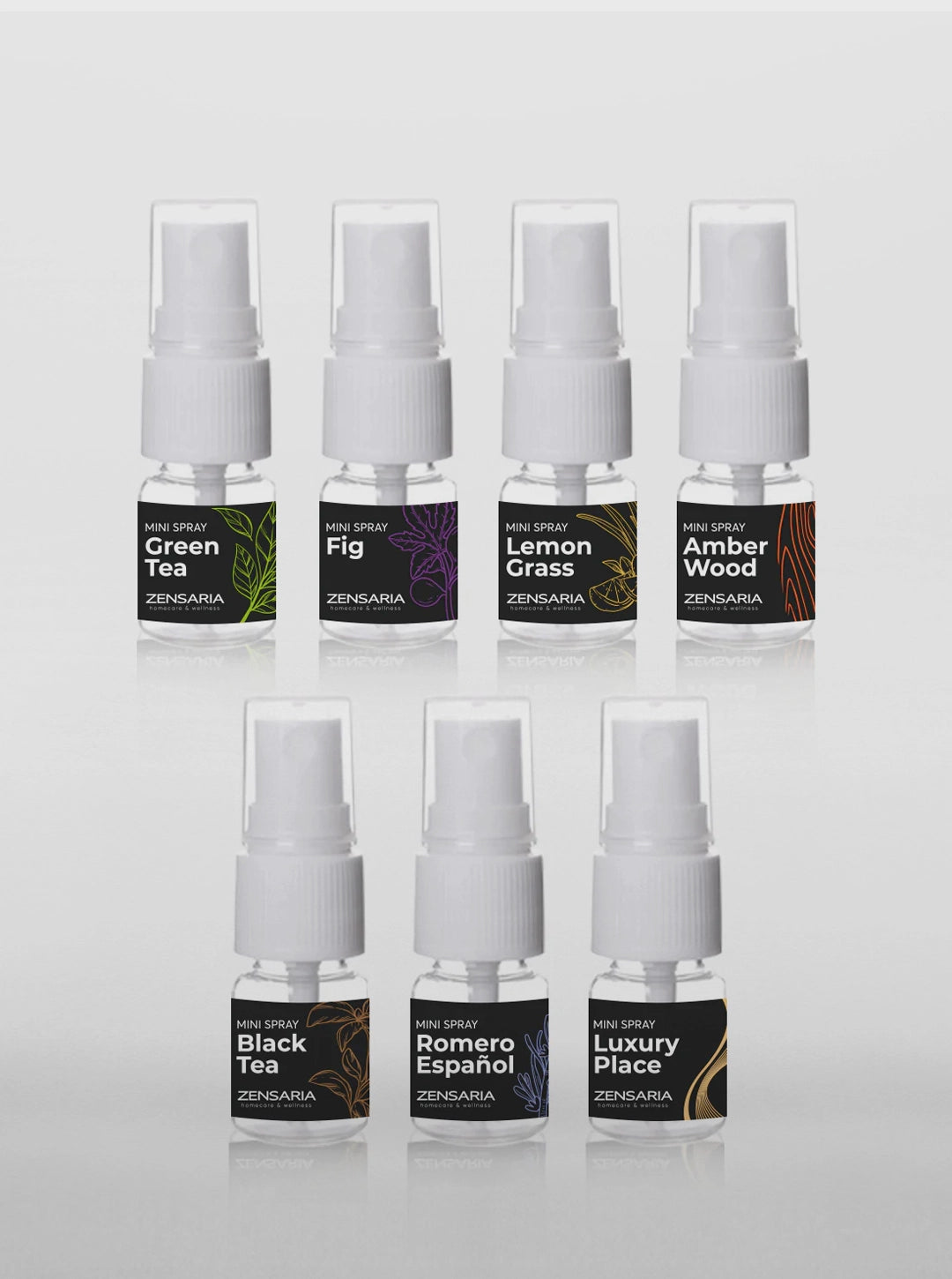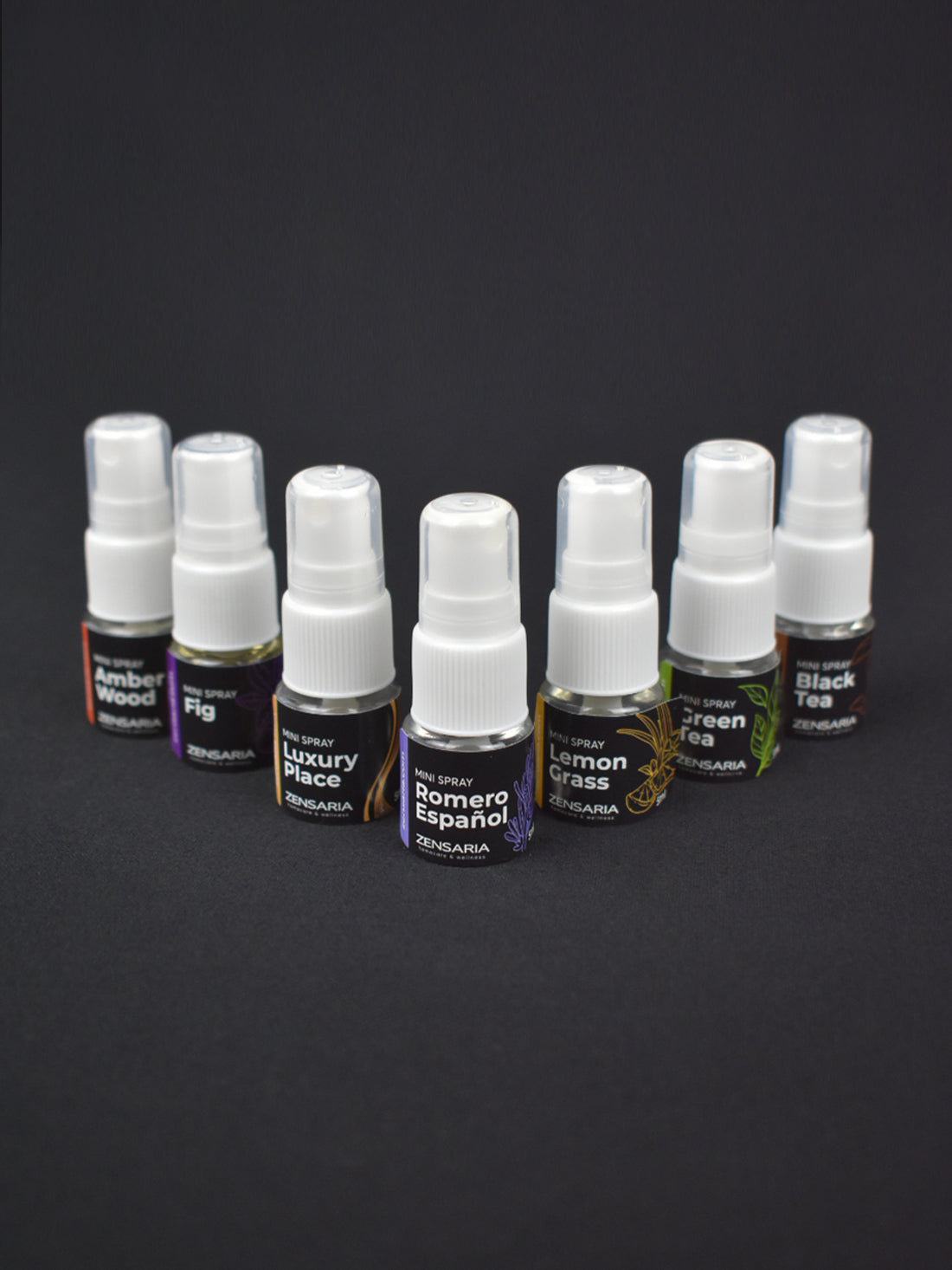El pack incluye 7 diferentes aromas de 5ml c/u: Romero Español, Black Tea, Green Tea, Fig, Luxury Place, Lemongrass, Amber Wood.