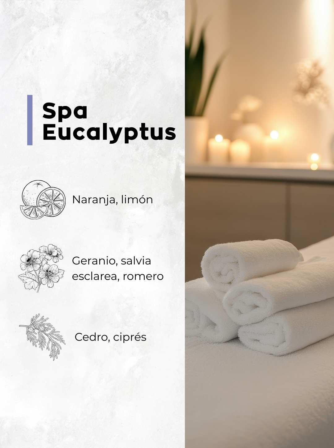 Spa Eucalyptus transforma tu espacio en un refugio de calma con una fragancia fresca, herbal y terapéutica. Las notas acuáticas de melón y lirio de los valles se fusionan con el aroma medicinal del eucalipto, creando una sensación revitalizante y equilibrada. Un delicado fondo de madera de sauna completa esta experiencia relajante, como un día de spa en casa o en tu lugar favorito.